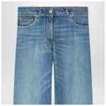 Versace medium blue cotton denim jeans with low-rise design, medium stone-washed finish, Medusa accessory, Versace leather logo patch, belt loops, front zip and button closure and five-pocket construction.