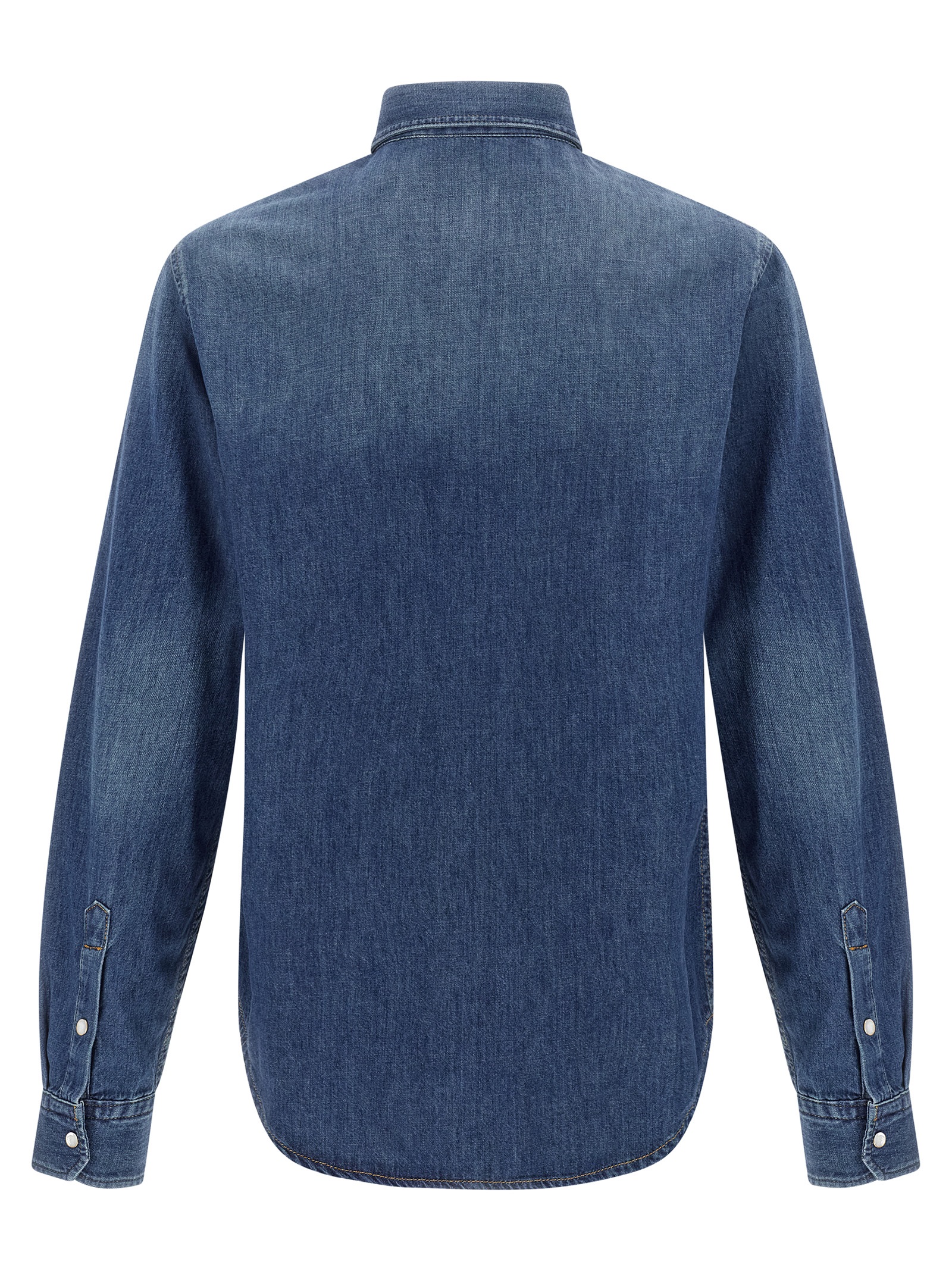 Light cotton denim shirt with medium stonewashed treatment, ‘Medusa’ patch, front snap button closure, long cuffed sleeves.