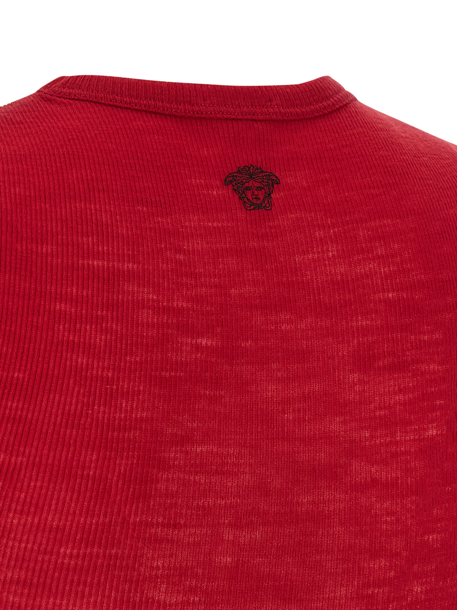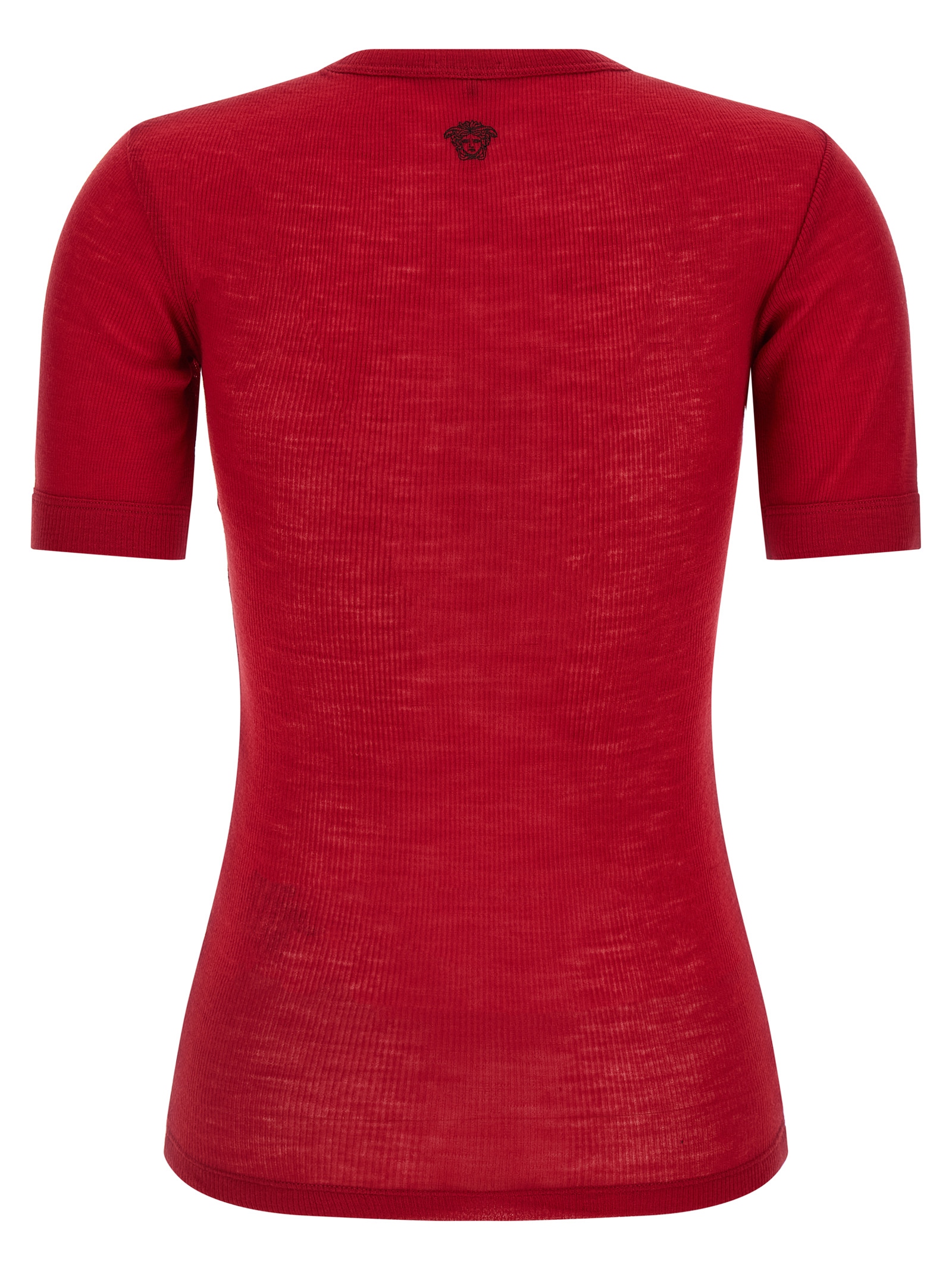 Ribbed stretch virgin wool t-shirt, Logo embroidery and contrast ‘medusa’ on the front, Crew neck, Short cuffed sleeves.