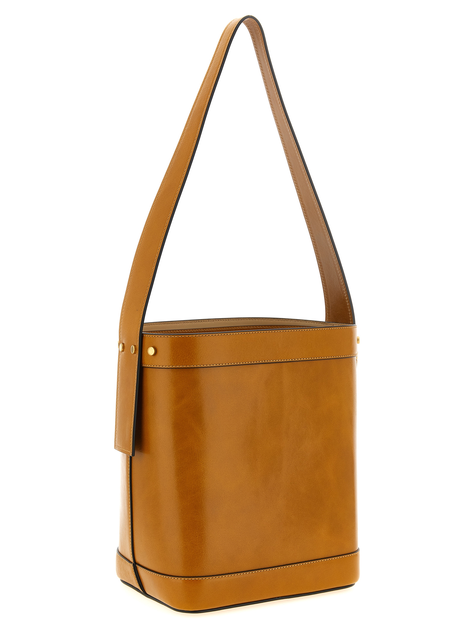 Small ‘pivot’ bucket bag in natural leather, 3d ‘medusa cameo’ detail and antiqued metal chain on the front, Double fixed handles that can be stored inside the bag, Internal magnetic closure, Rigid base, Shoulder strap.