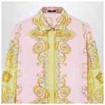 Versace silk twill shirt, featuring a yellow and pink Spring Barocco print, pointed collar, concealed front button closure, Medusa button, long sleeves and buttoned cuffs.