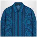 Versace petrol blue silk twill shirt with Barocco print, pointed collar, front button closure, long sleeves and buttoned cuffs.