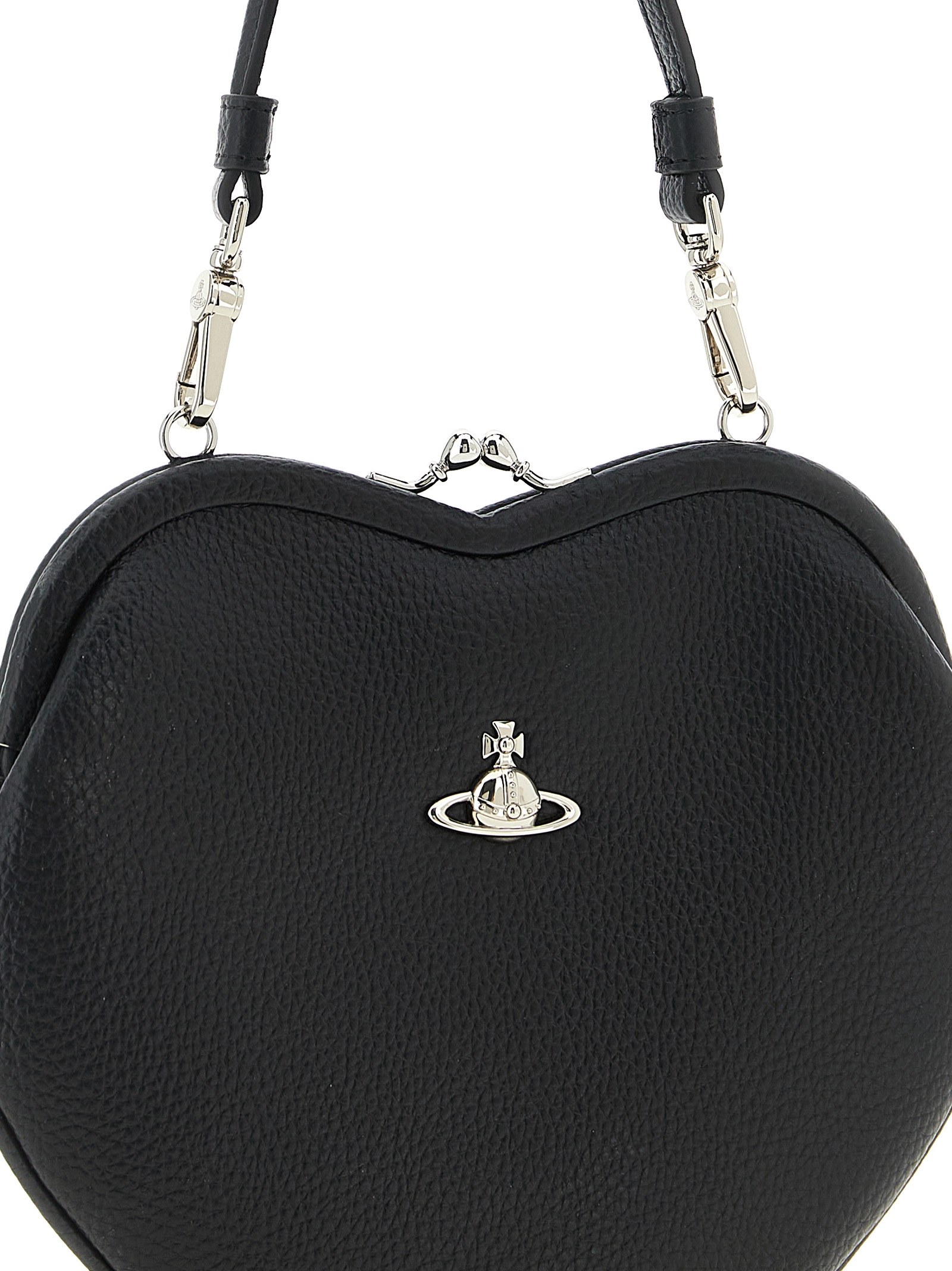 ‘belle heart frame’ handbag in garnet leather-effect fabric, Front metal ‘orb bas relief’ logo, Snap closure, Removable leather-effect fabric handle, Removable chain shoulder strap.
