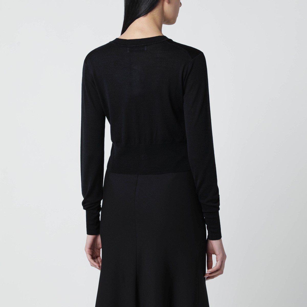 Black wool and silk Vivienne Westwood cropped crew-neck cardigan, featuring long sleeves, front button fastening, ribbed trims and a multicolour embroidered Orb logo on the chest.