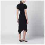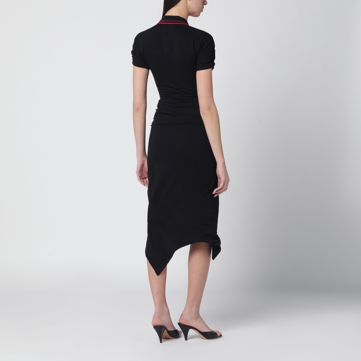 Black slightly stretch cotton piqué dress by Vivienne Westwood, featuring a draped design, fitted silhouette, flat collar, multicolour embroidered Orb logo on the chest, front button with cut-out detail, short sleeves, front slit, and asymmetric hem.