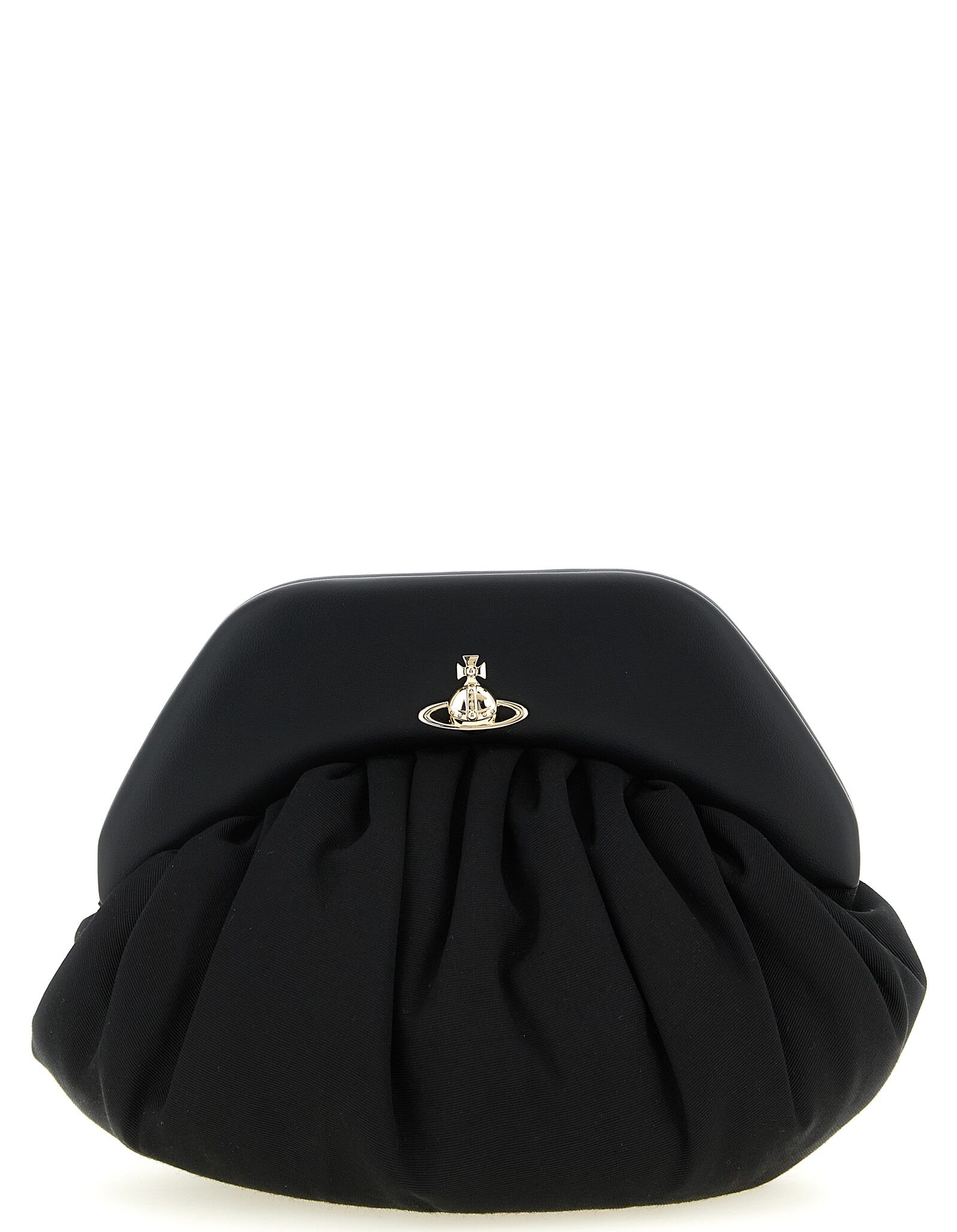 ‘Brooke’ crinkled fabric clutch, magnetic closure with outer leather-effect fabric and metal acting as an inner mirror, metal Orb logo on the front, removable ‘Hazel’ handle.