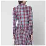 Linen jacket by Vivienne Westwood with tartan pattern in shades of red, green, and purple, featuring long sleeves with buttoned cuffs, fitted corset-style design, puffed shoulders, front button closure, back slit, small front pockets, and a deep neckline.
