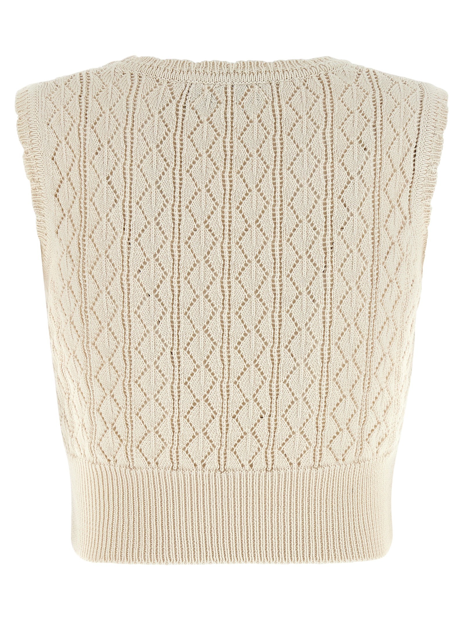 ‘ella’ cotton top knitted with ‘frost flower’ pattern and geometric lace, Crop model, ‘orb’ logo embroidery, Crew neck, Band on the hem.