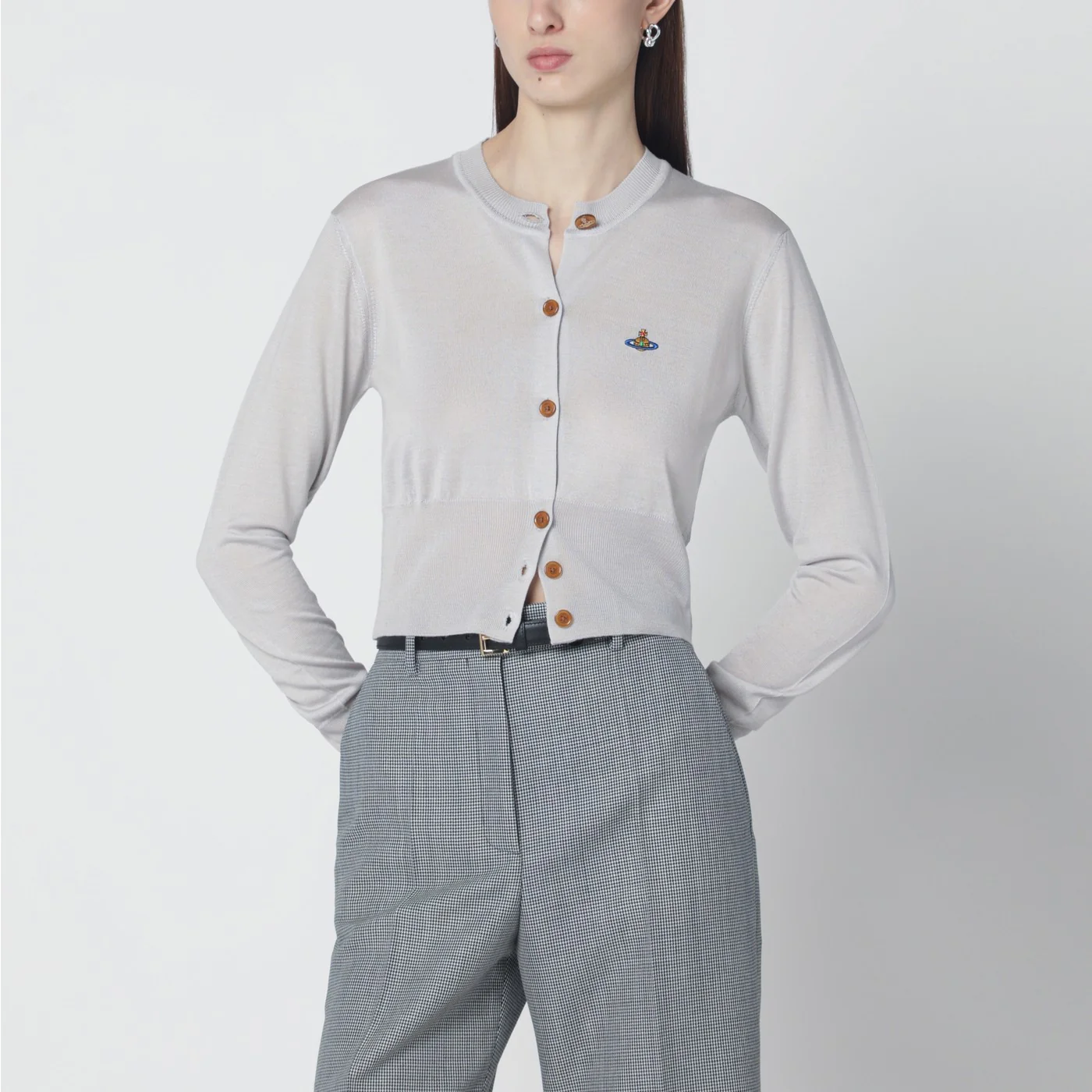 Cropped round-neck cardigan by Vivienne Westwood in light grey wool and silk