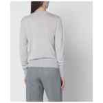Light grey wool and silk crew-neck cardigan by Vivienne Westwood, featuring long sleeves, front button closure, ribbed trims, and multicolour embroidered Orb logo on the chest.