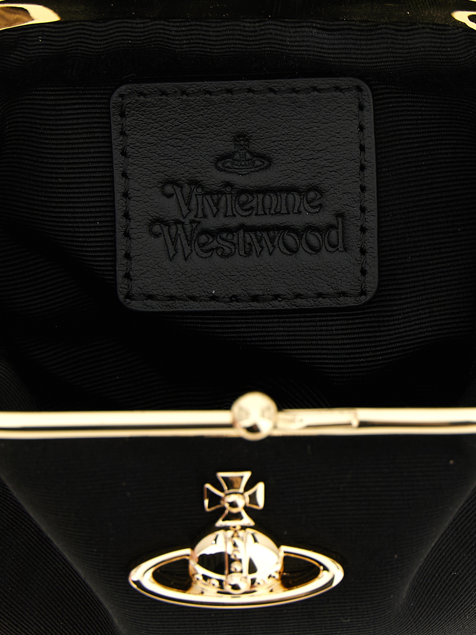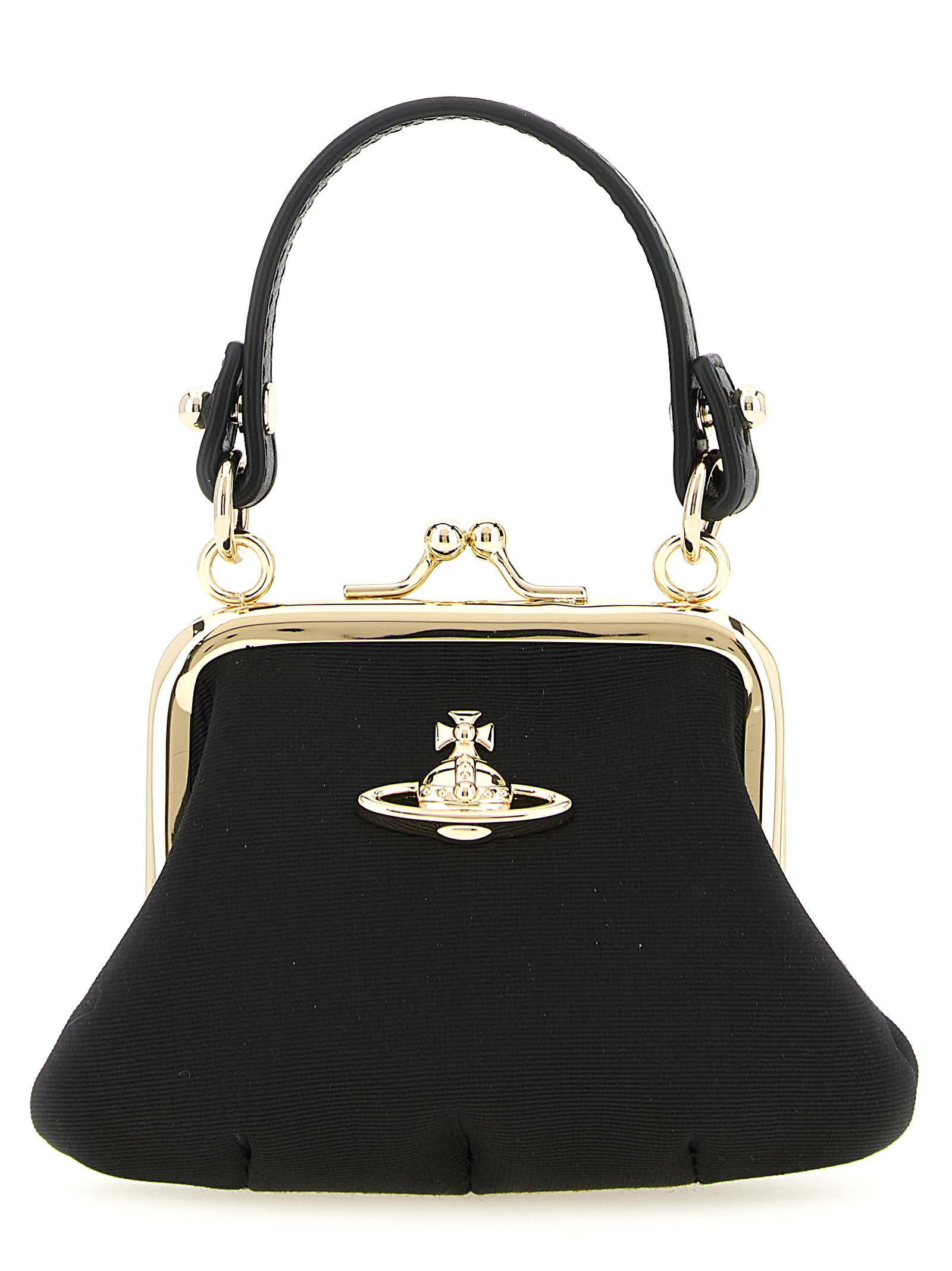 ‘mini granny’ handbag in moiré fabric, Front metal orb logo, Snap closure, Removable handle, Removable chain shoulder strap, Back belt loop in tone-on-tone leather-effect fabric with embossed logo.