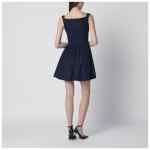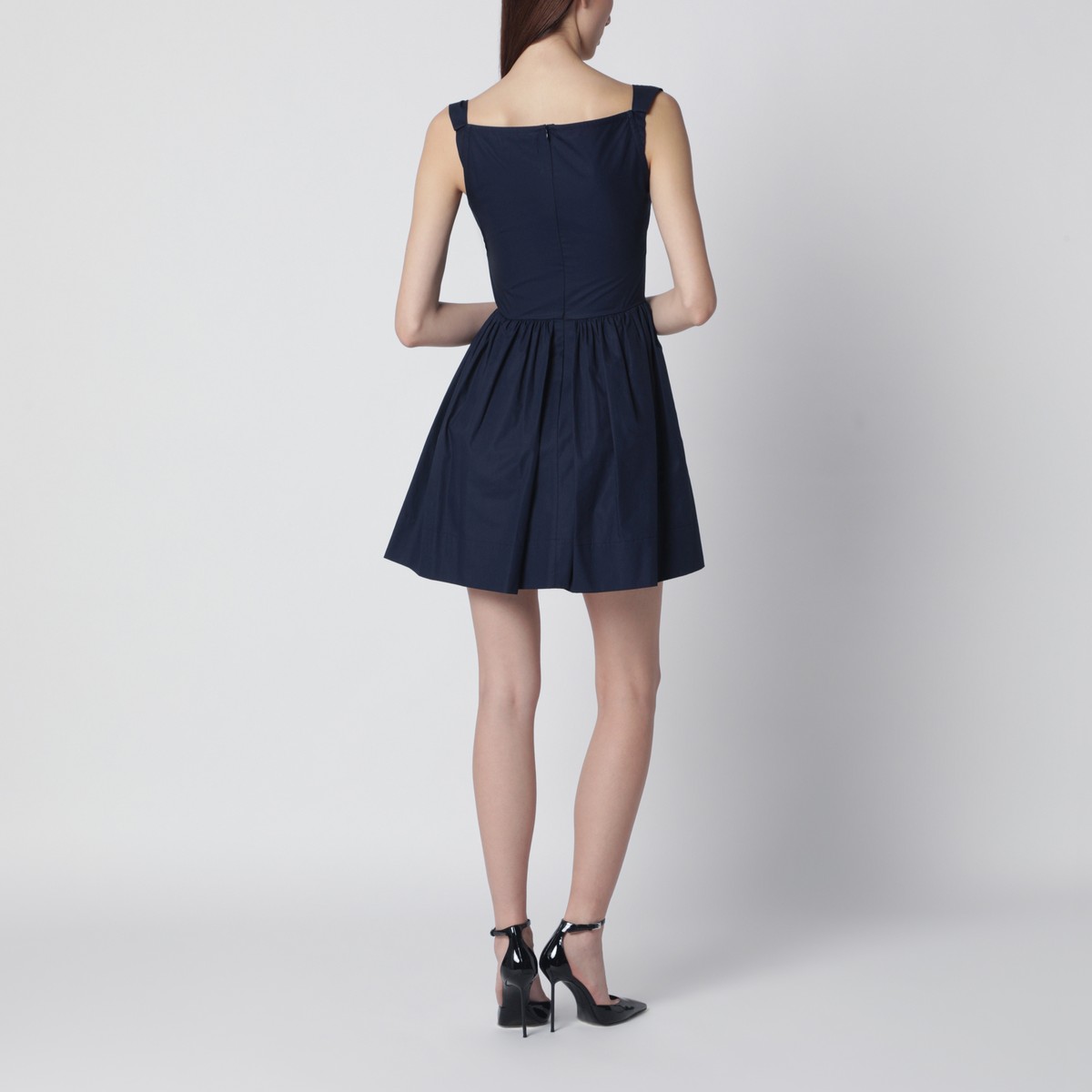 Navy blue cotton mini dress by Vivienne Westwood, featuring a corset-style bodice, multicolour embroidered Orb logo at the side, flared skirt, zip closure and draped neckline.