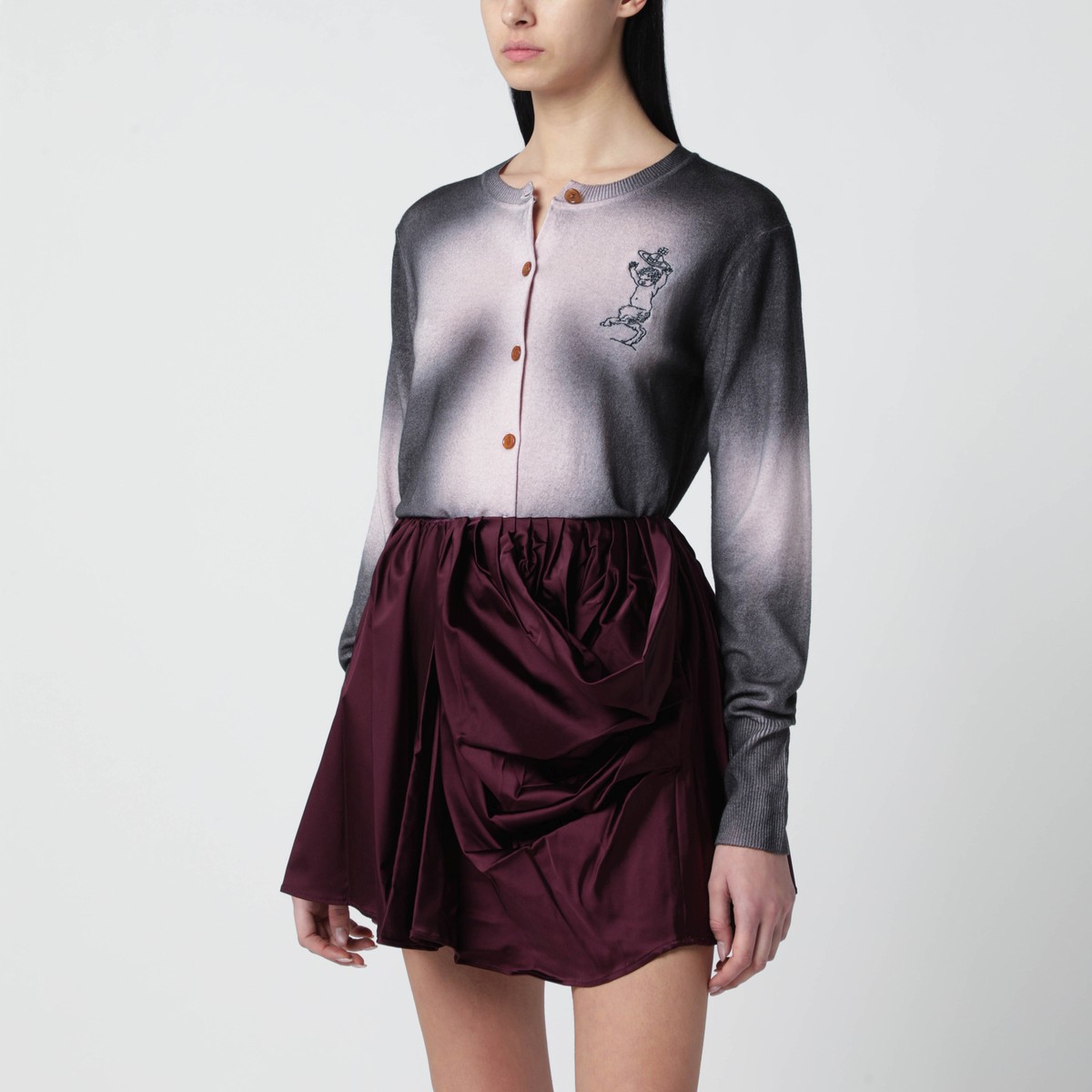 Pink and black dégradé wool and cashmere crew-neck cardigan by Vivienne Westwood, featuring a button front closure, long sleeves, embroidered logo on the chest and ribbed trims.