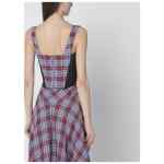 Linen corset by Vivienne Westwood with tartan pattern in shades of red, green, and purple, featuring a sculptural bodice with back zip closure, multicolour embroidered Orb logo on the front, straight neckline, tie-up shoulder straps, mesh side panels, and pointed hem.