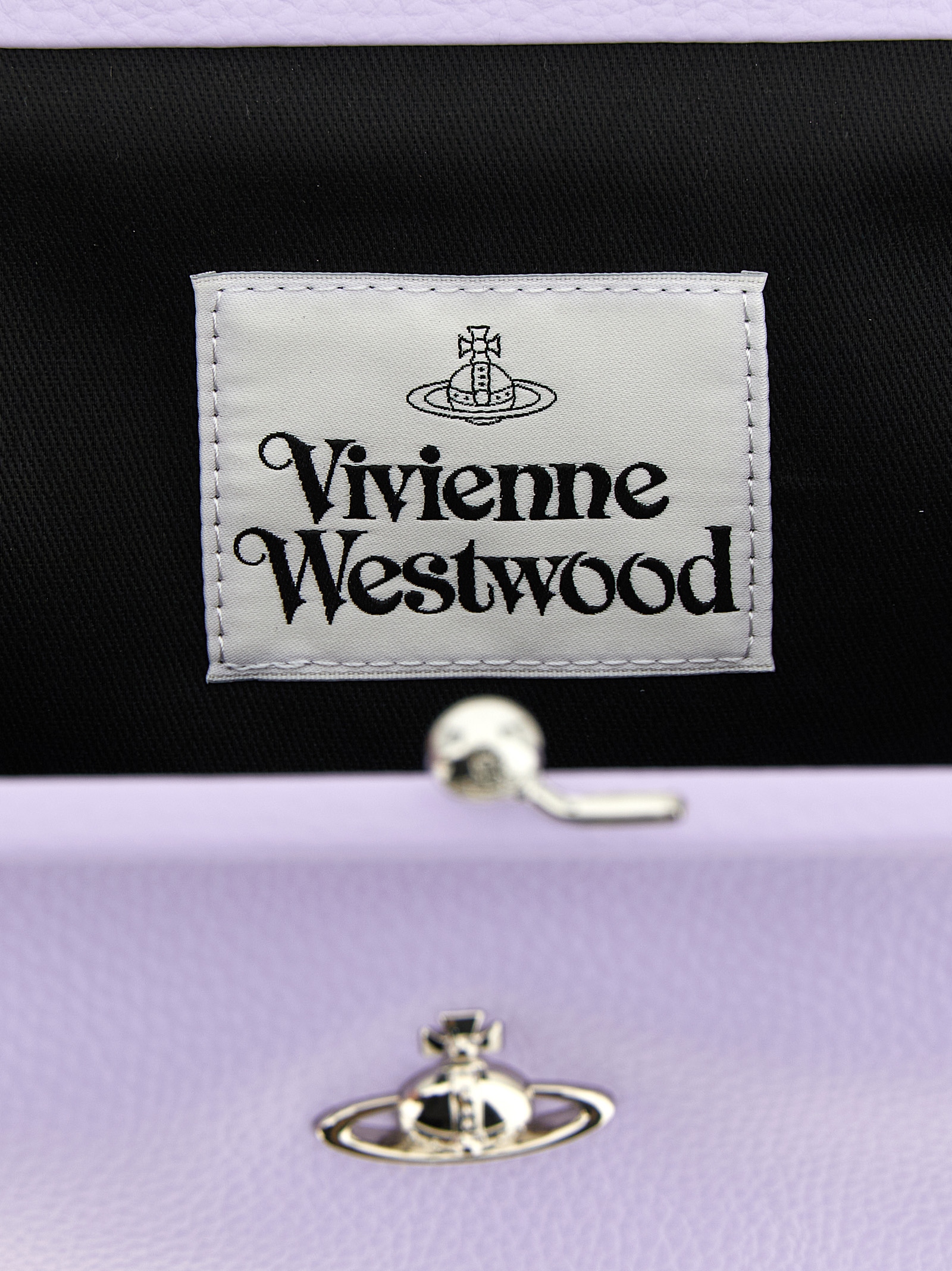 Vivienne clutch in hammered leather-effect fabric, Front metal ‘orb bas relief’ logo, Snap closure, Removable handle.