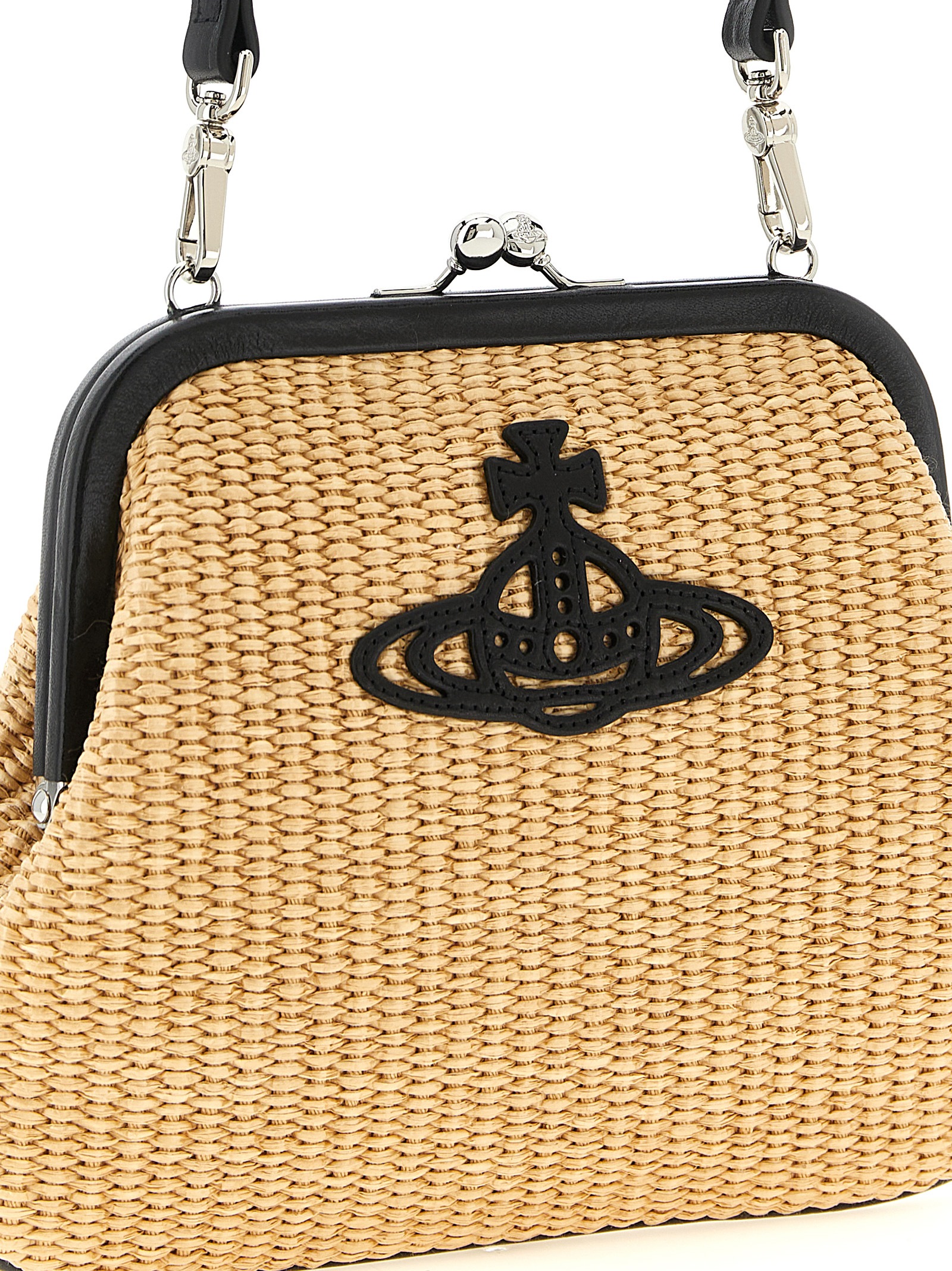 Braided raffia vivienne clutch with smooth leather details, Front ‘line orb’ logo patch, Snap closure, Removable handle.