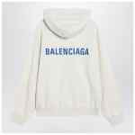 White cotton hoodie by Balenciaga, featuring long sleeves, a front kangaroo pocket, ribbed edges, distressed details, dropped shoulders, a front zip closure, contrasting logo lettering on the chest and back, and a regular fit.