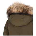 olive green duck down filling detachable fur hood concealed zip button closure flap pockets ribbed cuffs Grace long parka