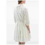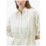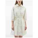 ecru cotton broderie anglaise spread collar front button placket three-quarter length puff sleeves tied waist tiered skirt straight hem above-knee length Cotton shirt dress