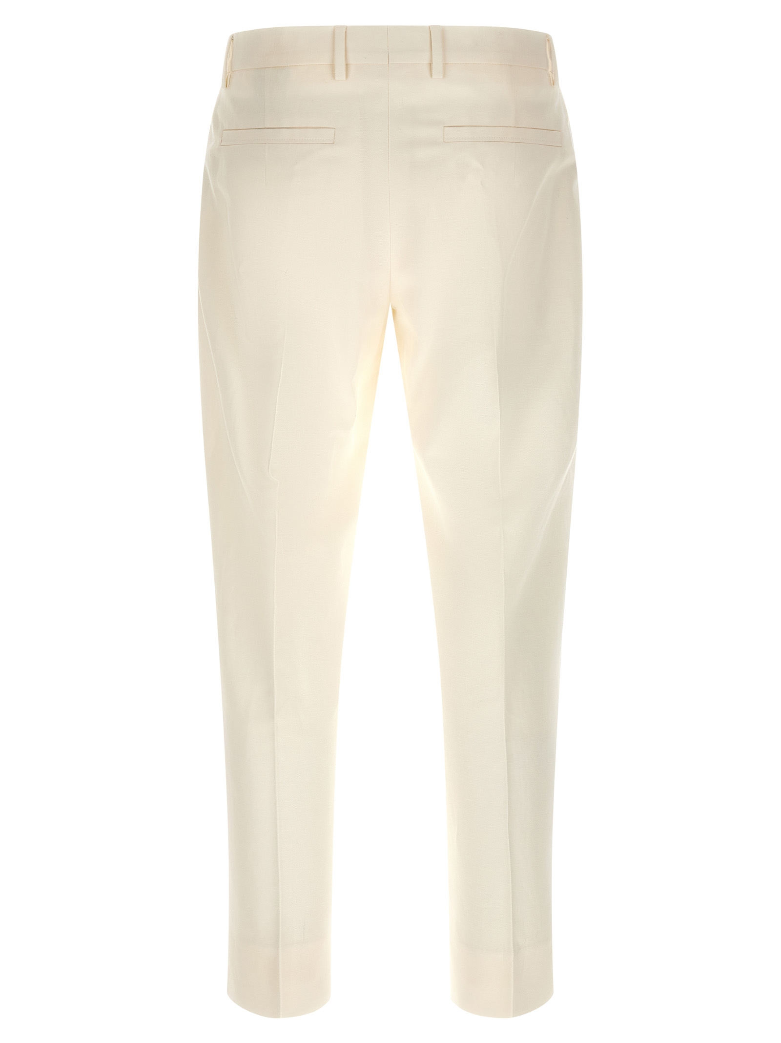 Cotton and linen blend pants, Formal model with front pleats, Regular fit, Front button hook and zip closure, Side welt pockets, Back welt pockets, Belt loops at the waist. Size and Fit – True to size fit
