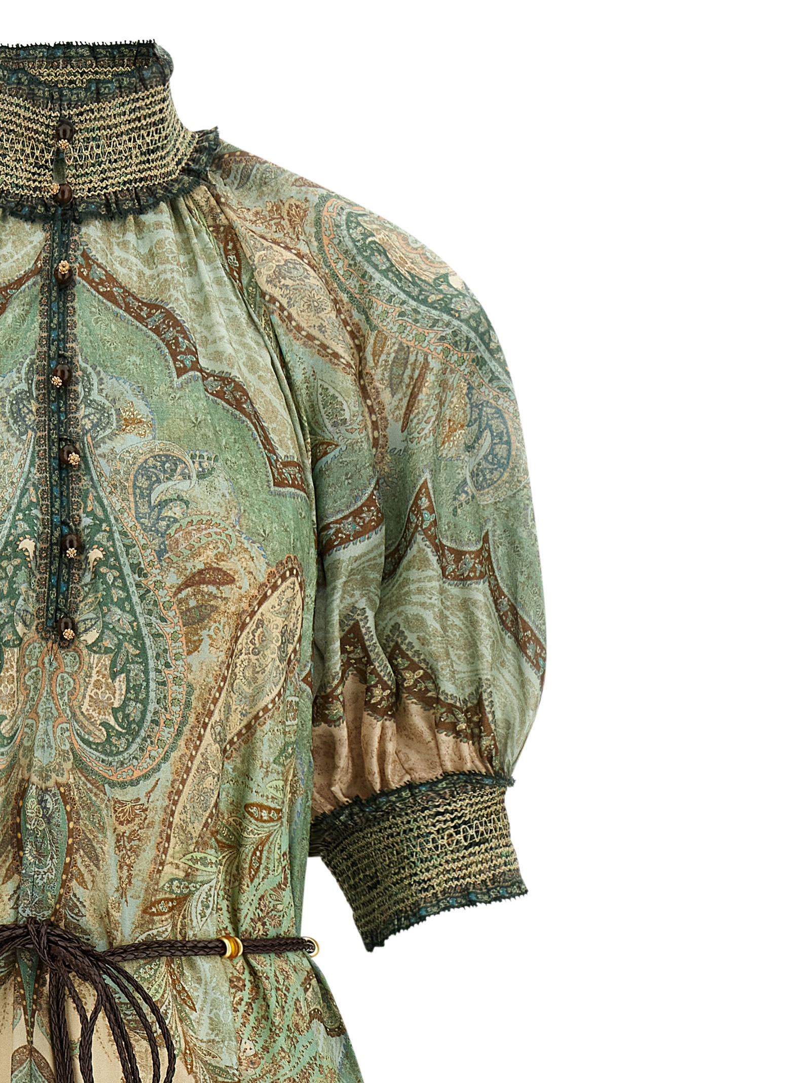 ‘billow wanderlust’ long dress in tapestry-patterned silk habotai with a-line silhouette, Curled high neck finished with lamé thread, Front rouleau button closure, Short puff sleeves with elastic cuffs finished with lamé thread, Removable petticoat, Rope belt with removable beads. Size and Fit – true to size fit