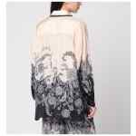 Zimmermann cream silk shirt with an all-over black patterned print, featuring a front button closure, classic collar with contrasting trim, long sleeves with buttoned cuffs, side slits, and a comfortable fit.