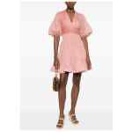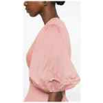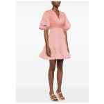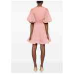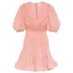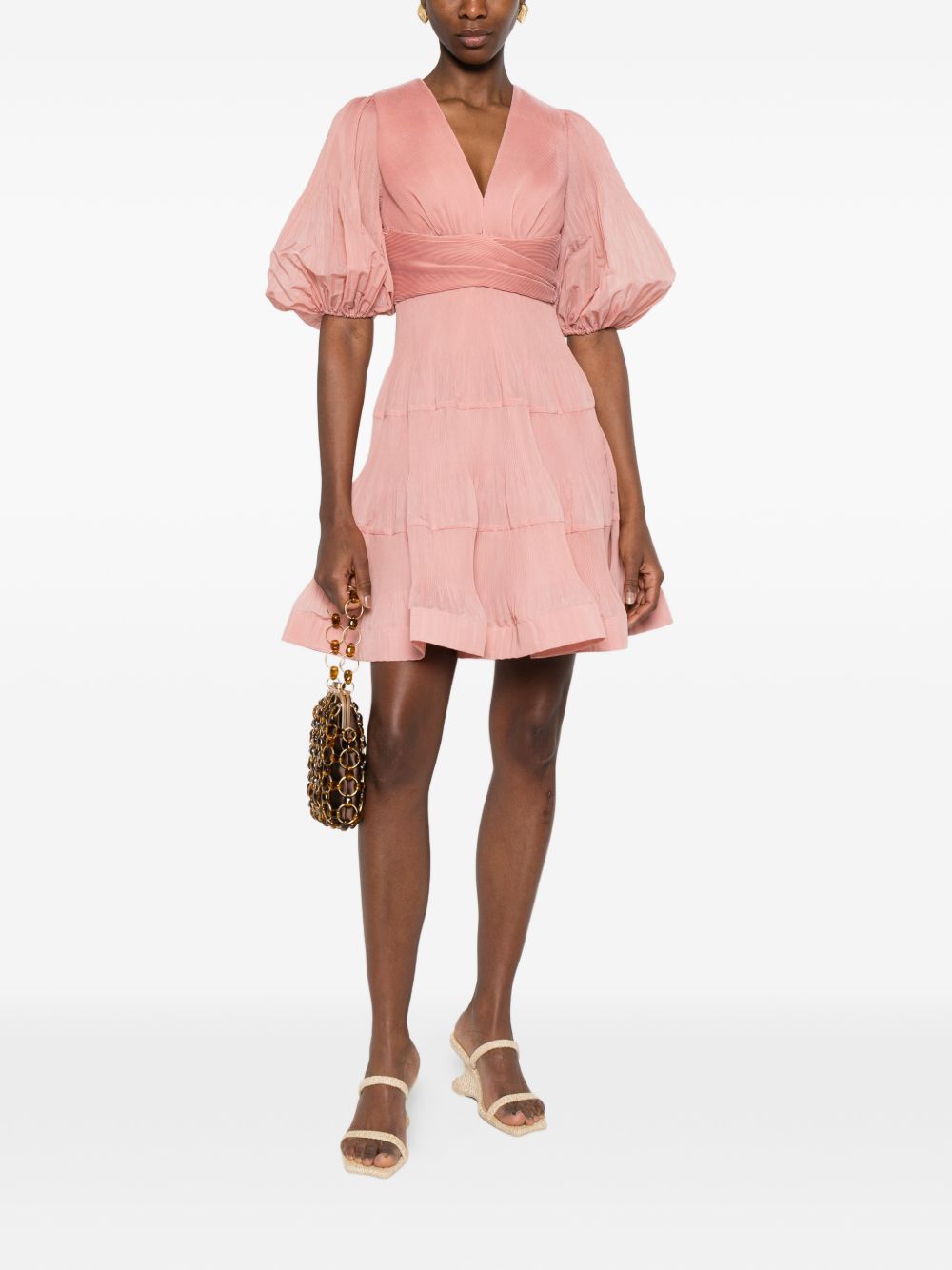 pink, pleated, V-neck, short sleeves, layered skirt, gathered waist. Pleated mini dress.