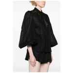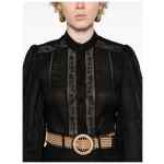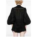 black cotton lace trim band collar front button fastening long puff sleeves elasticated cuffs curved hem Lace trim detail shirt