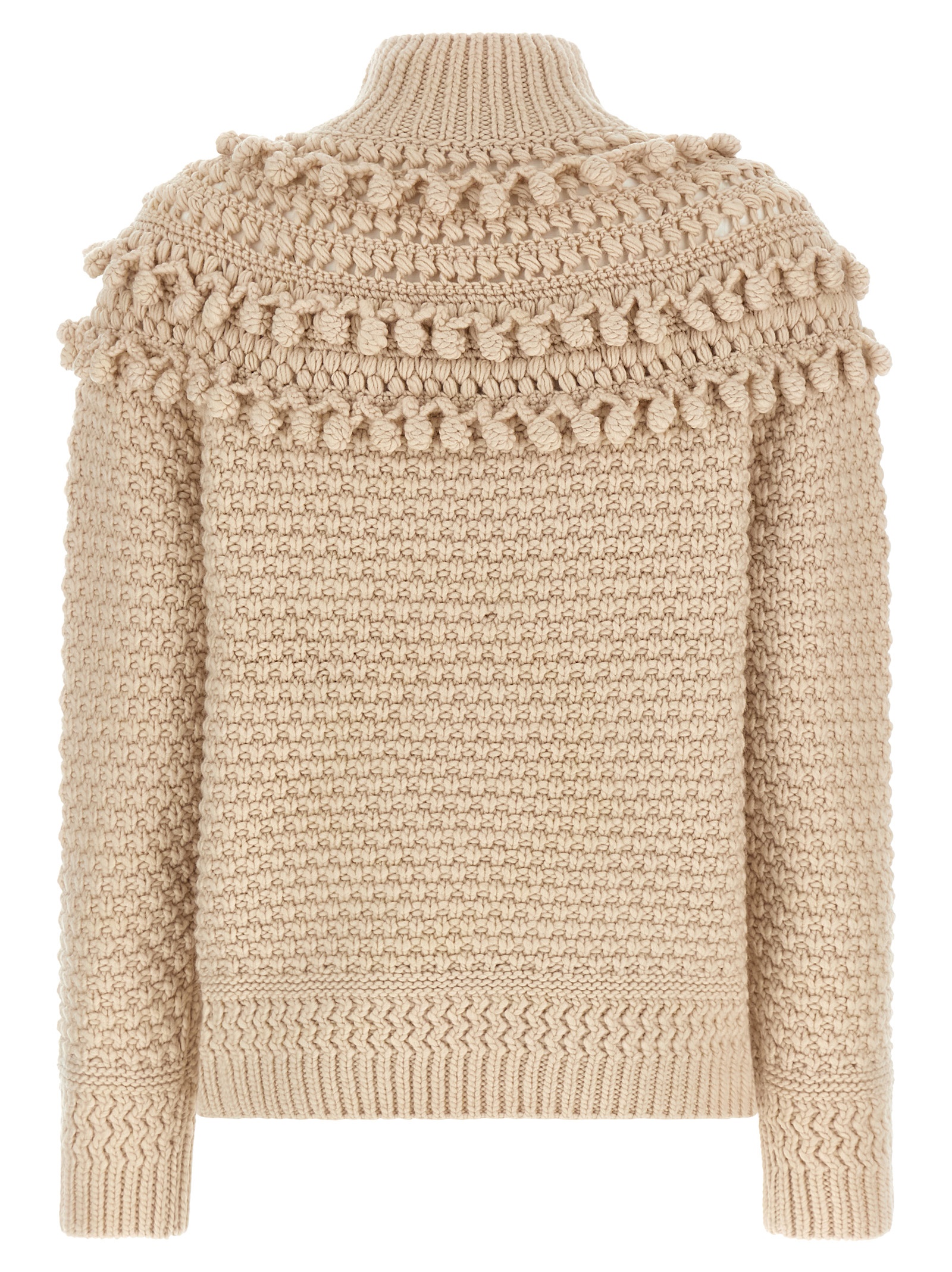 ‘hypnotic bauble’ knitted wool sweater with pompom, High neck, Long sleeves with cuffs and dropped shoulders.
