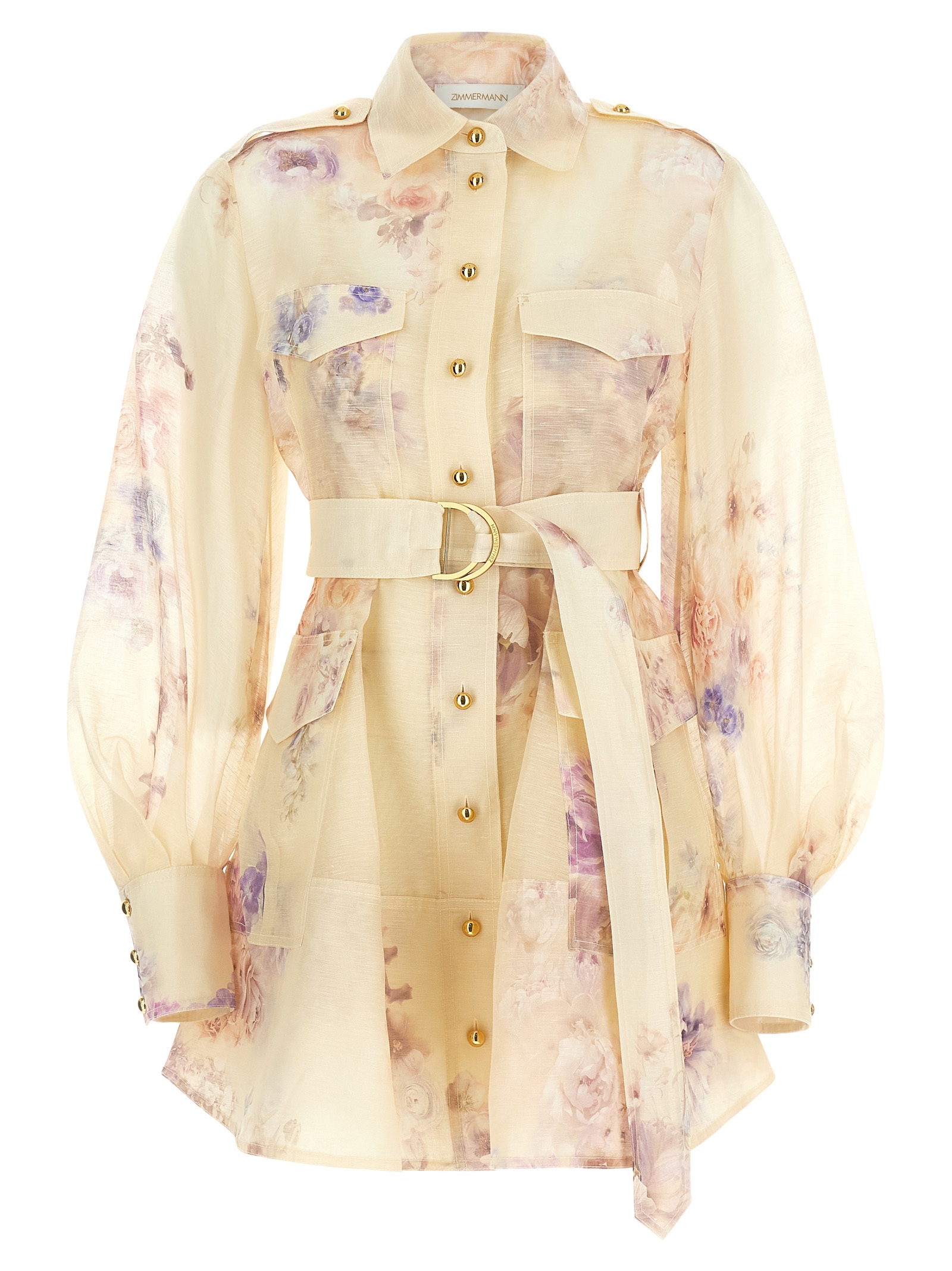 ‘Hypnotic Utility Mini’ floral patterned linen and silk dress, utility style shirt style, front button closure, pockets, long balloon sleeves with cuffs, removable petticoat with adjustable straps, removable belt.
