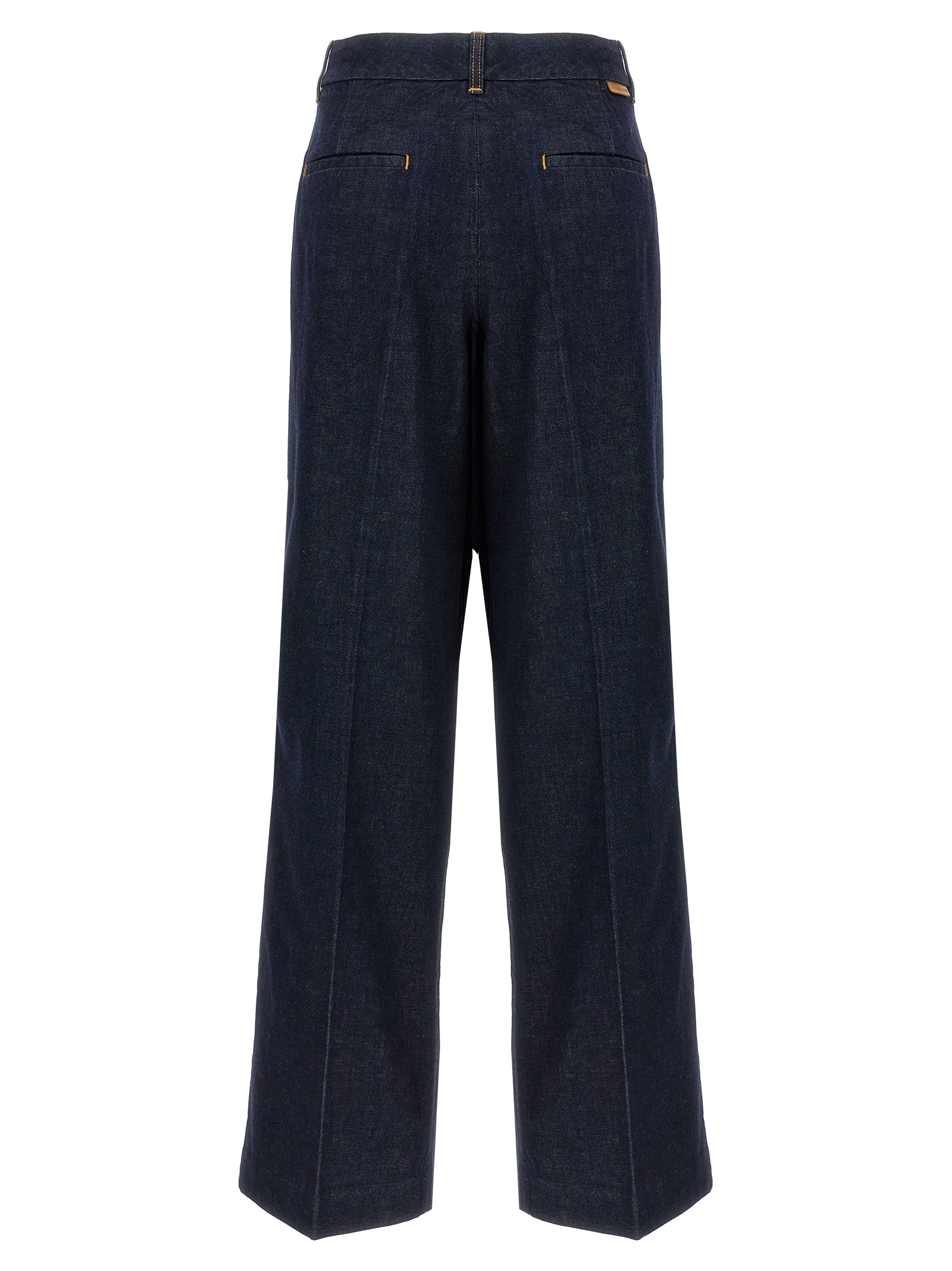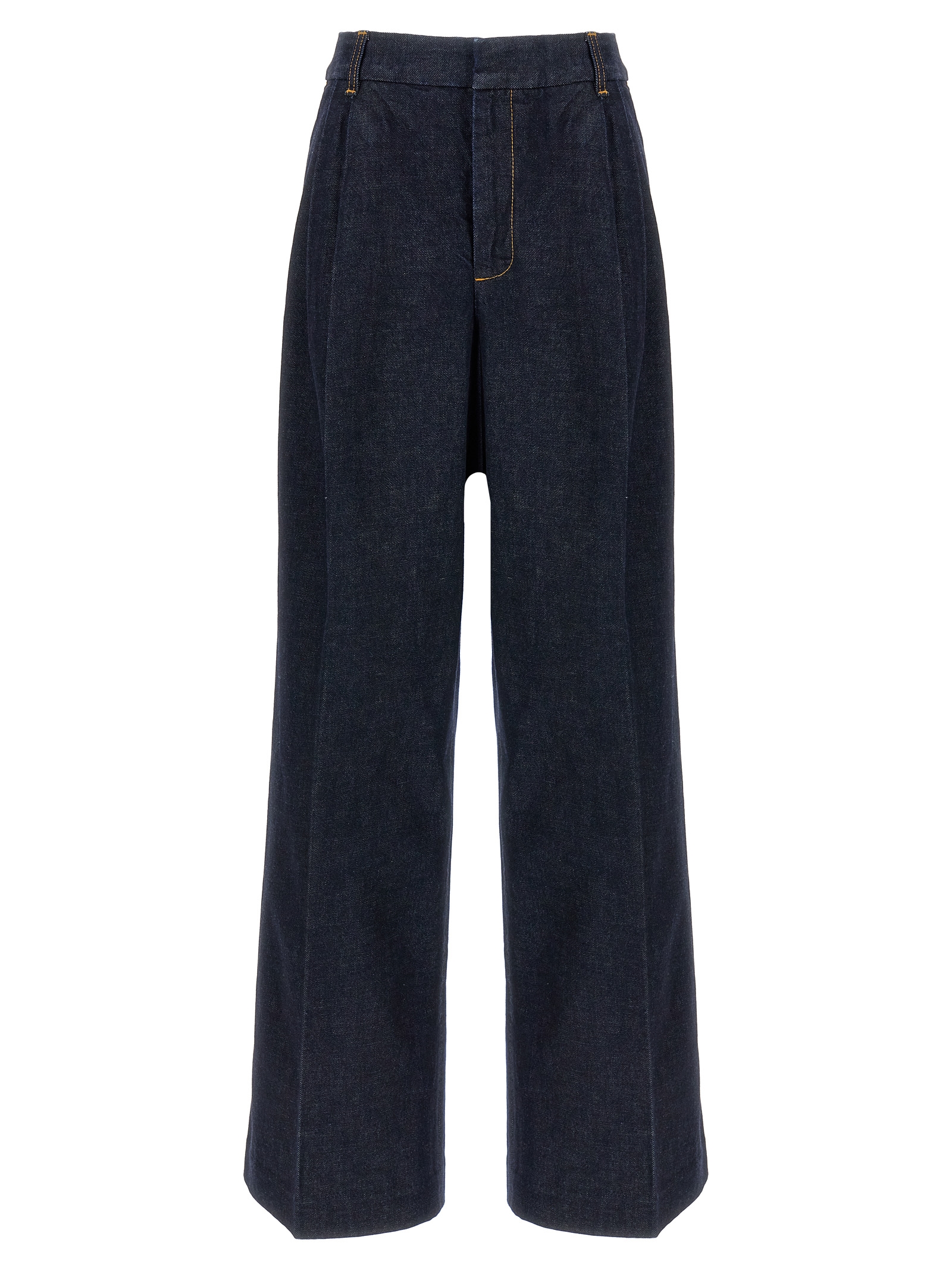 ‘Illustration Denim’ cotton denim jeans with hook and button zip closure, pockets, wide leg with double pence.