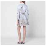 Light blue floral-print linen mini dress by Zimmermann, featuring long puff sleeves, elastic cuffs, front buttons, removable scarf-belt, high collar, back zip closure, and flared skirt.