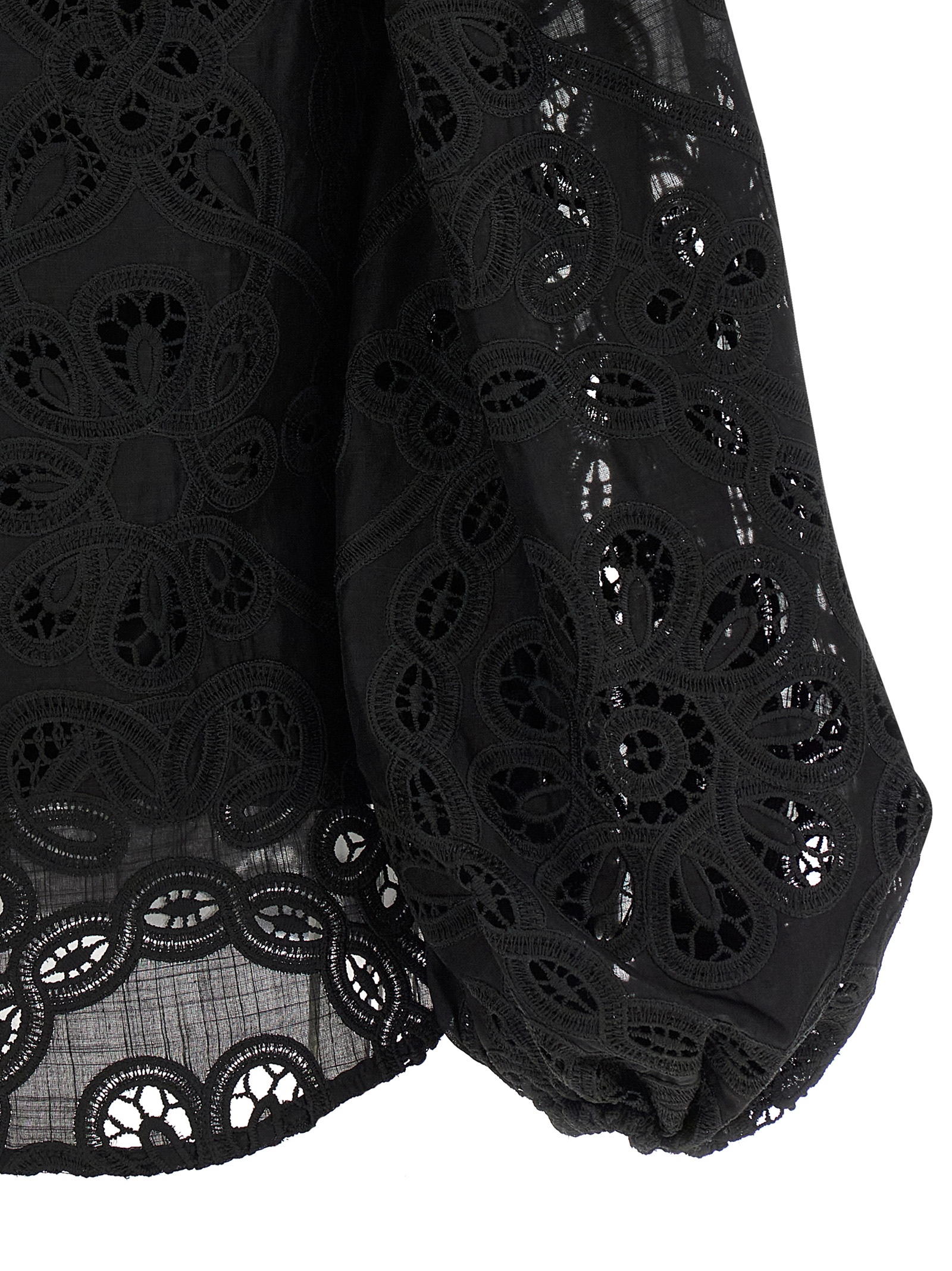 ‘Rhiannon’ embroidered and perforated cotton shirt, mandarin collar, front closure with embroidered buttons, long sleeves wide at the hem and elasticated cuffs.