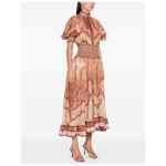 dark red silk paisley print smocked waistband ruffled hem Wanderlust silk maxi skirt