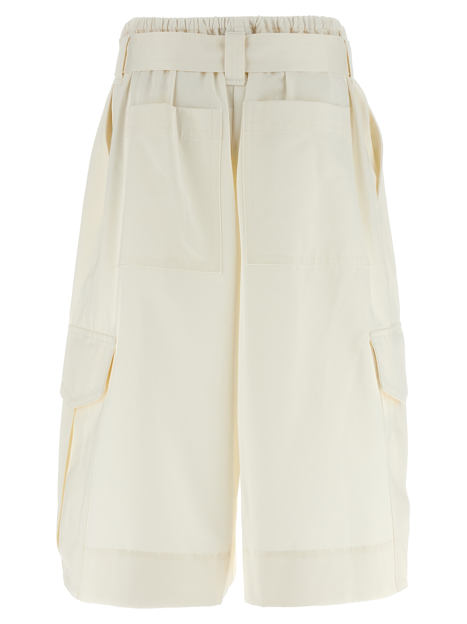 ‘The Illuminate Bermuda Short’ cargo cotton bermuda shorts with medium waist and wide leg, trompe l’oeil flap, adjustable drawstring elastic waistband, pockets, removable belt.