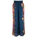 deep blue elasticated waistband drawstring detail vivid floral design side seam pockets lightweight fabric Ascension silk trousers