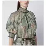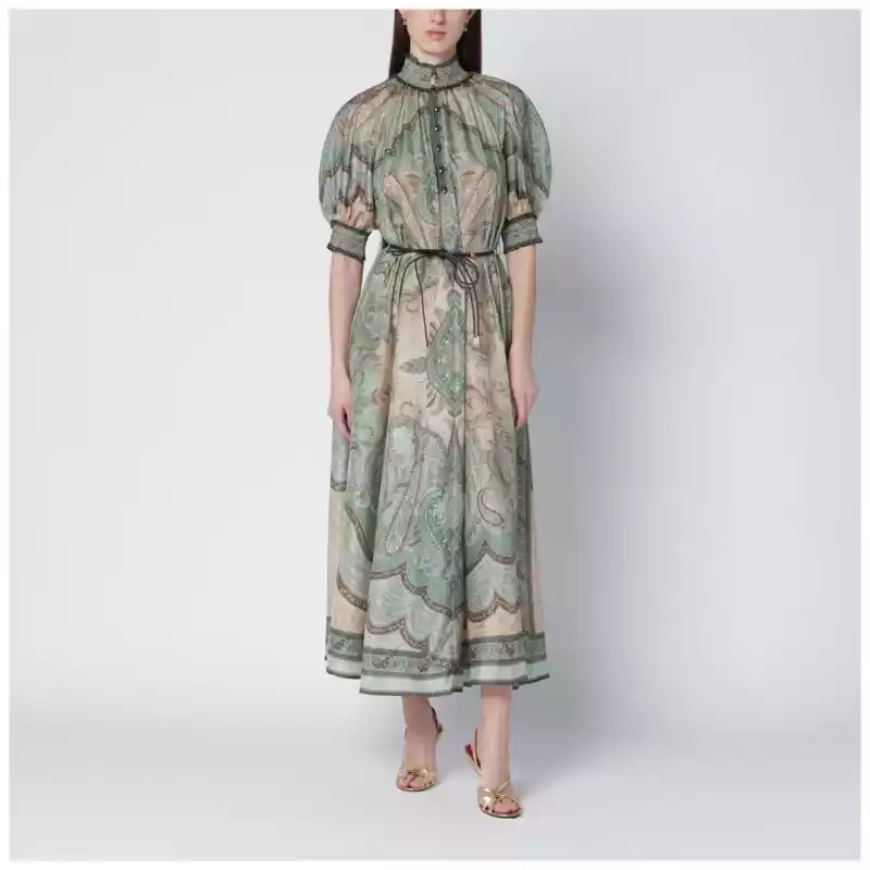 Dress by Zimmermann in silk with tapestry style print in shades of green and brown Gathered high neck Front buttons Short puff sleeves Two side pockets Removable rope belt with beads. Size and Fit – Model wears size 1 Model measurements: Height: 181 cm Chest: 81 cm Waist: 62 cm Hips: 89 cm