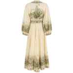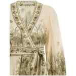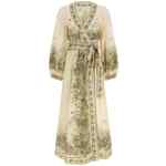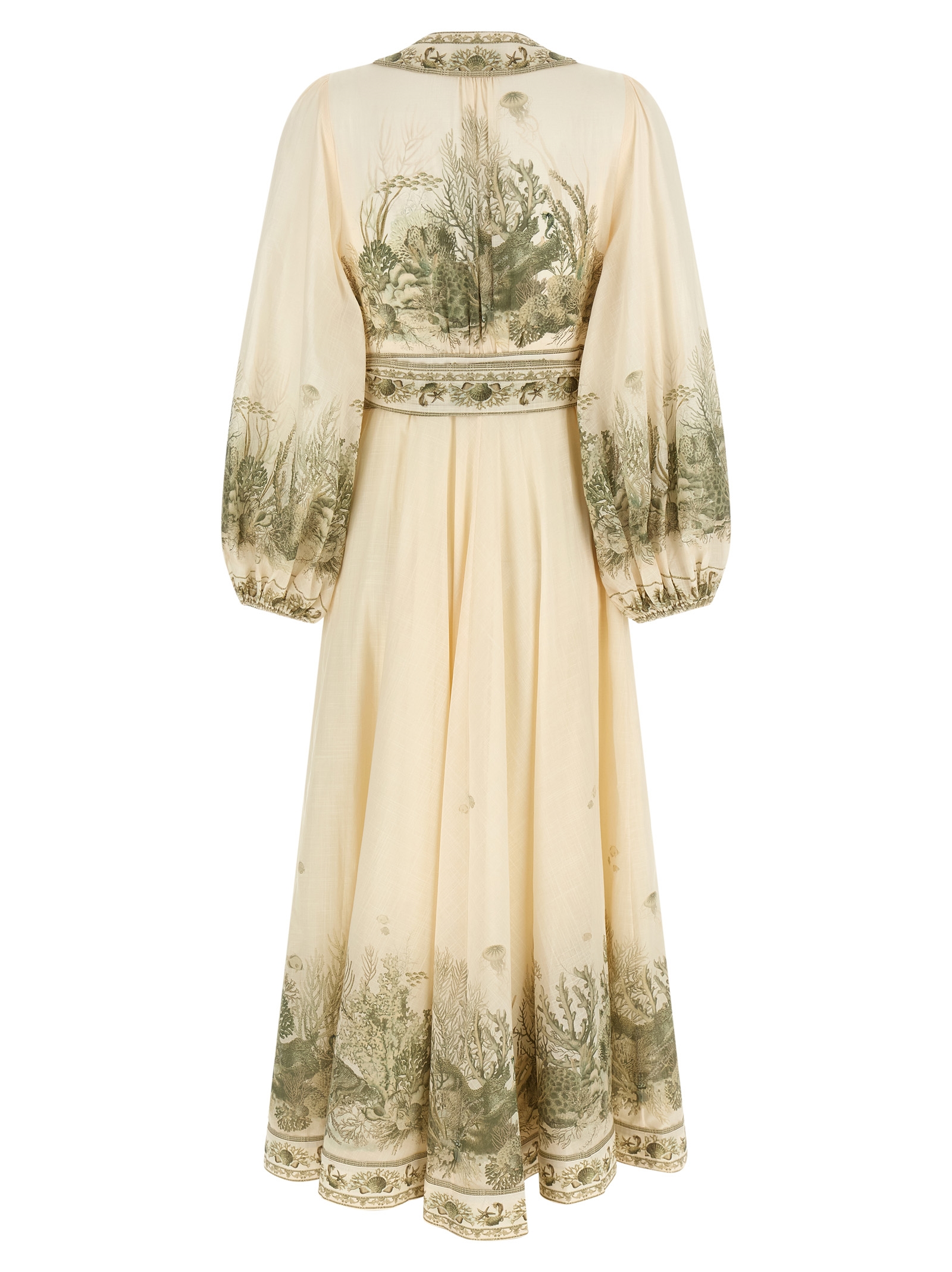 ‘wanderlust wrap midi’ all-over toile print cotton dress, Wallet style with belt to tie at the waist, Deep v-neck, Long puff sleeves with elastic cuffs. Size and Fit – true to size fit
